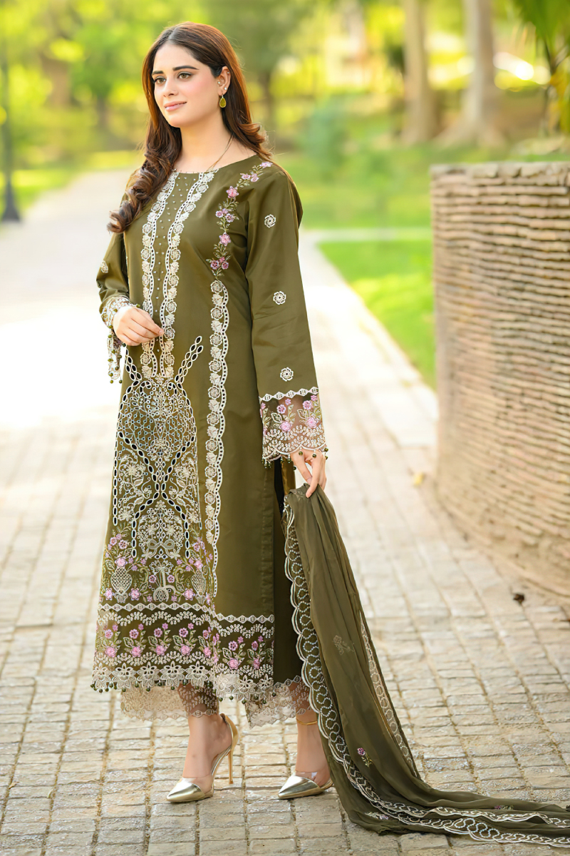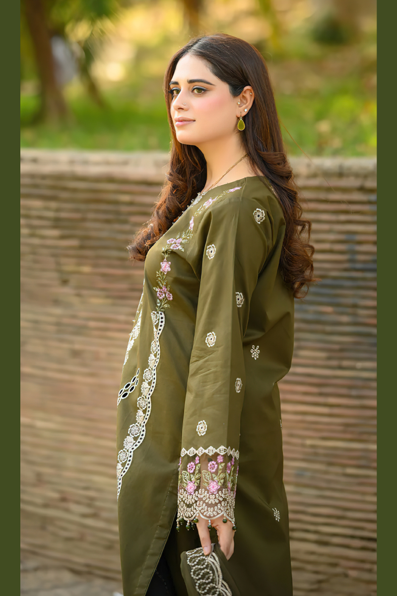 Paired with an embroidered bamber chiffon dupatta that adds a soft, flowing drape, and a dyed lawn trouser for comfort, this 3-piece unstitched ensemble is perfect for casual daytime wear, festive gatherings, and summer occasions. A signature Qalamkar design that blends comfort, grace, and classic appeal.