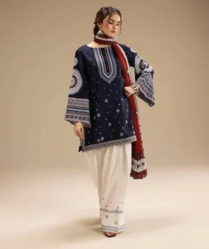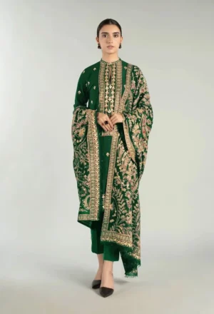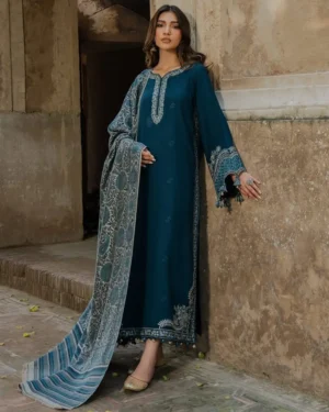 A premium Pure Dhanak 3-piece suit featuring full heavy embroidery on the front and sleeves, paired with a warm Twill/Wool printed shawl and dyed trouser.…